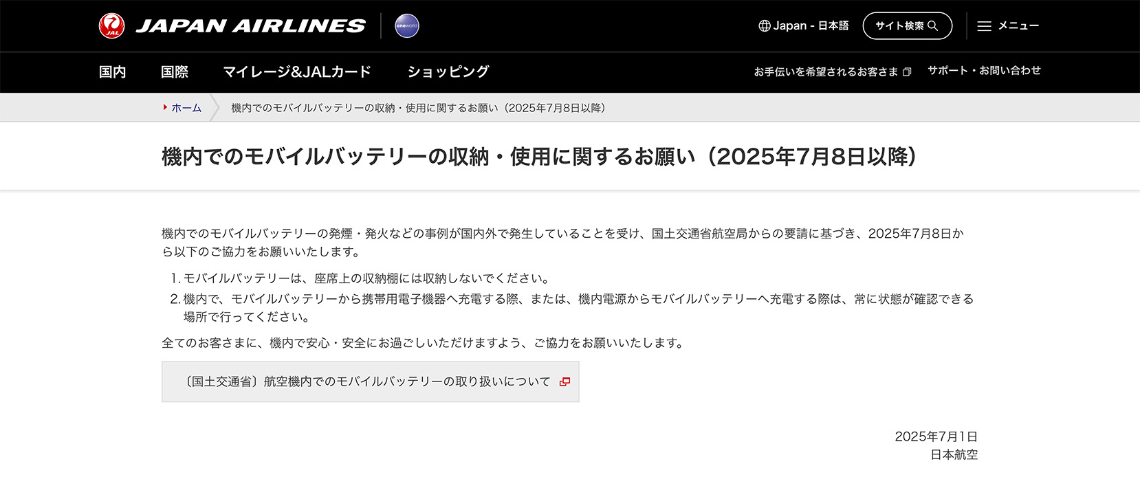 この事故などを背景に、2025年7月1日、国土交通省と国内の航空会社が加盟する定期航空協会が、モバイルバッテリーの取り扱いに関する新たなルールを発表しました。各航空会社は翌日までに自社のウェブサイトなどで案内を公表し、周知期間を一週間設けたうえで、7月8日から新ルールを施行しています。