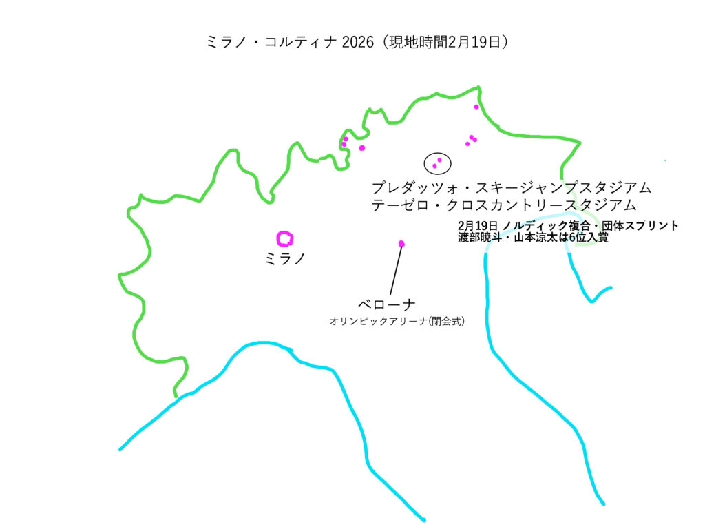 オーストリアとの国境に近いコルティナよりもミラノ寄りにあるプレダッツォとテーゼロで行われたノルディック複合・団体スプリントでは渡部暁斗(あきと)と山本涼太の日本チームが6位入賞しました。