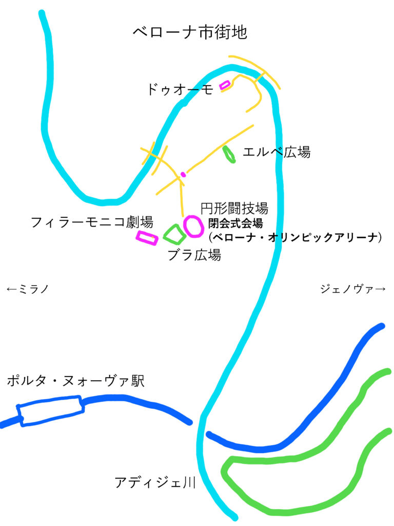 イタリアのベローナはミラノとヴェネチアの中間地点にあり、地理的にはオリンピック会場のコルティナやリヴィーニョなどからも集まりやすい場所になります。