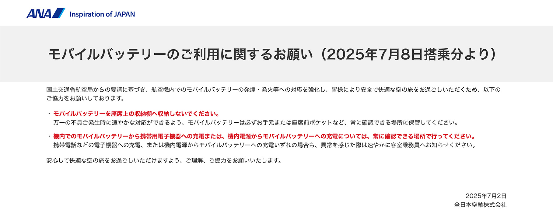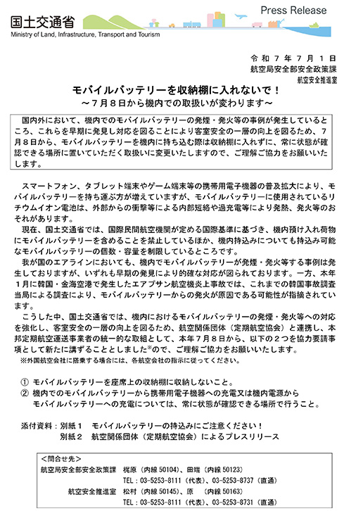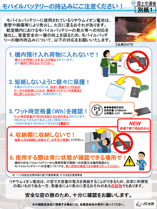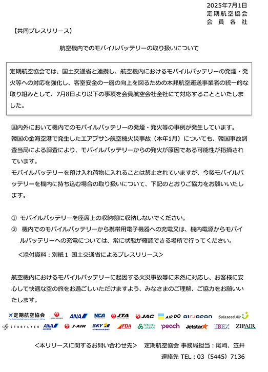 この事故などを背景に、2025年7月1日、国土交通省と国内の航空会社が加盟する定期航空協会が、モバイルバッテリーの取り扱いに関する新たなルールを発表しました。各航空会社は翌日までに自社のウェブサイトなどで案内を公表し、周知期間を一週間設けたうえで、7月8日から新ルールを施行しています。