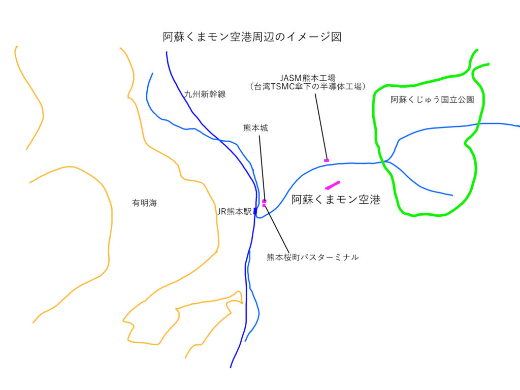 阿蘇くまモン空港は熊本市内から東に向かって約20キロメートルに位置します。