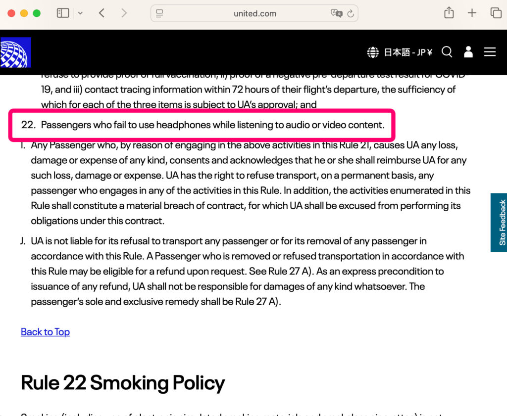 ユナイテッド航空のように規約で禁止していませんが、イヤホン・ヘッドフォン利用が前提でマナーとして周りに迷惑をかけないようにという考え方でした。