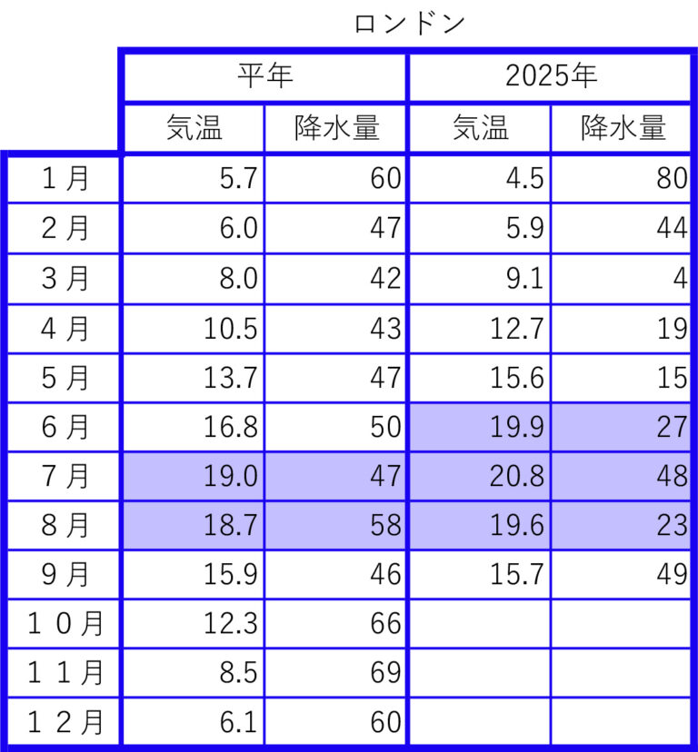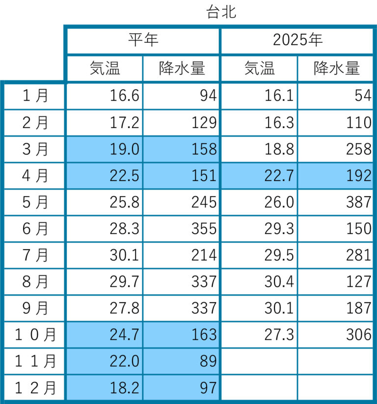 (データについて)気象データは日本の気象庁ウェブサイト(https://www.jma.go.jp/)、台湾交通部中央気象局のウェブサイト(https://www.cwb.gov.tw/)から月間データを検索しました。ロンドンはヒースロー空港、パリはオルリー空港のデータです。