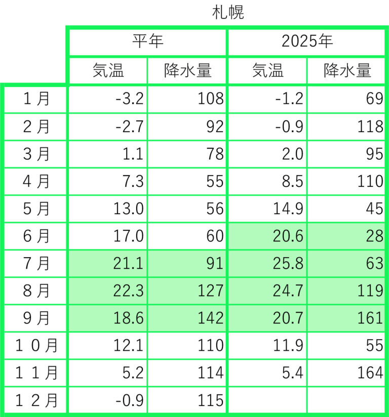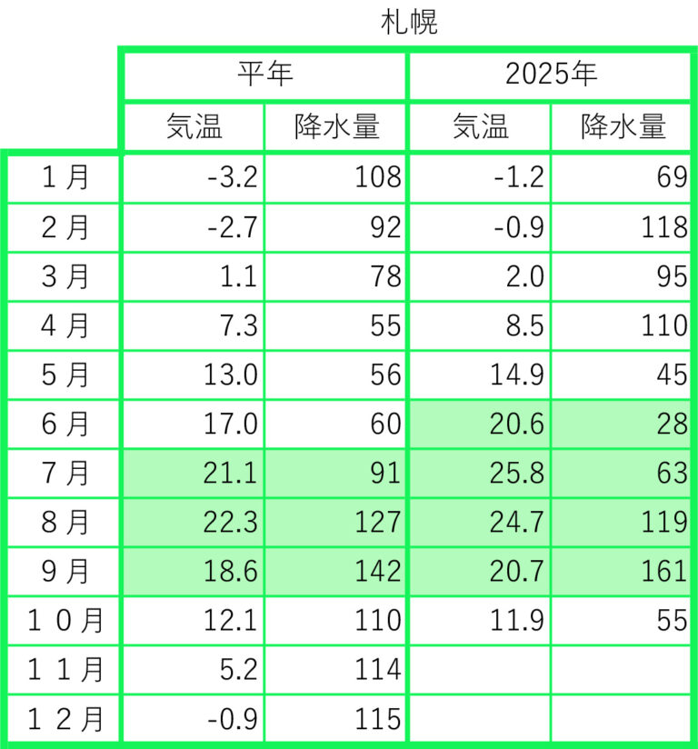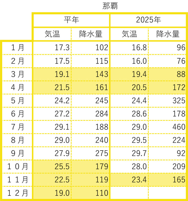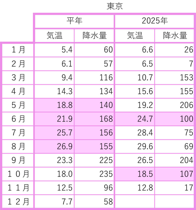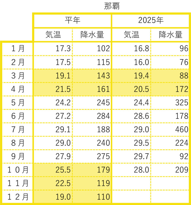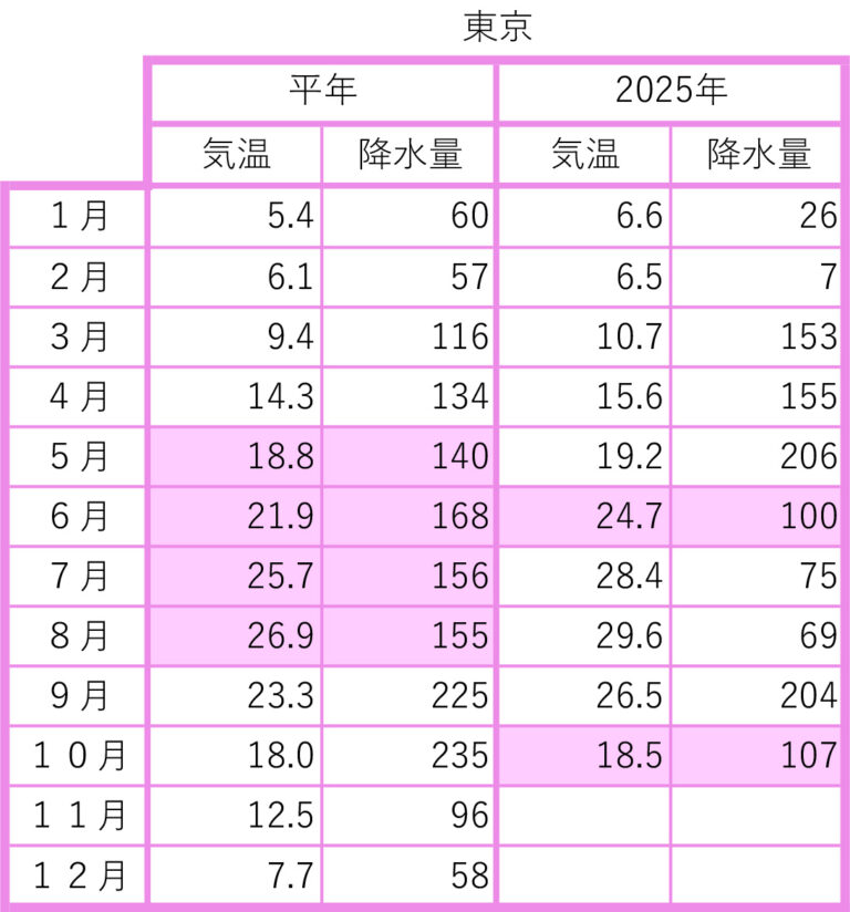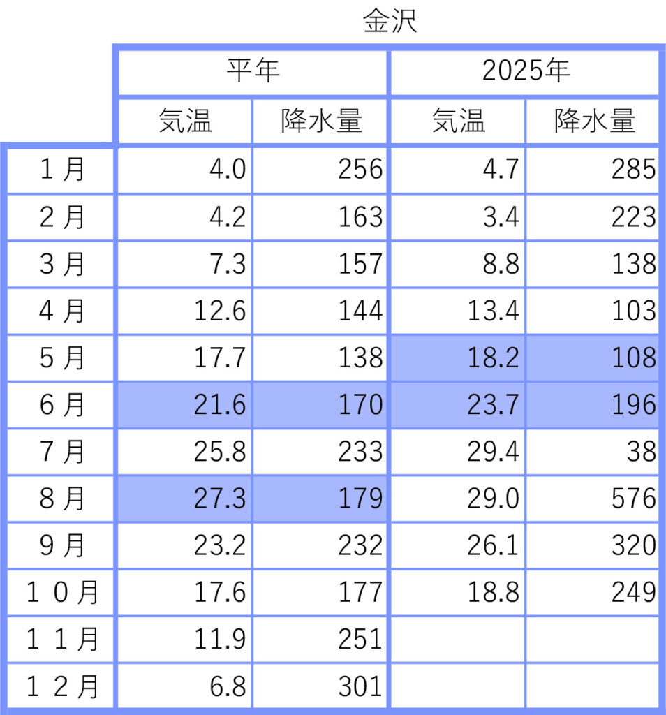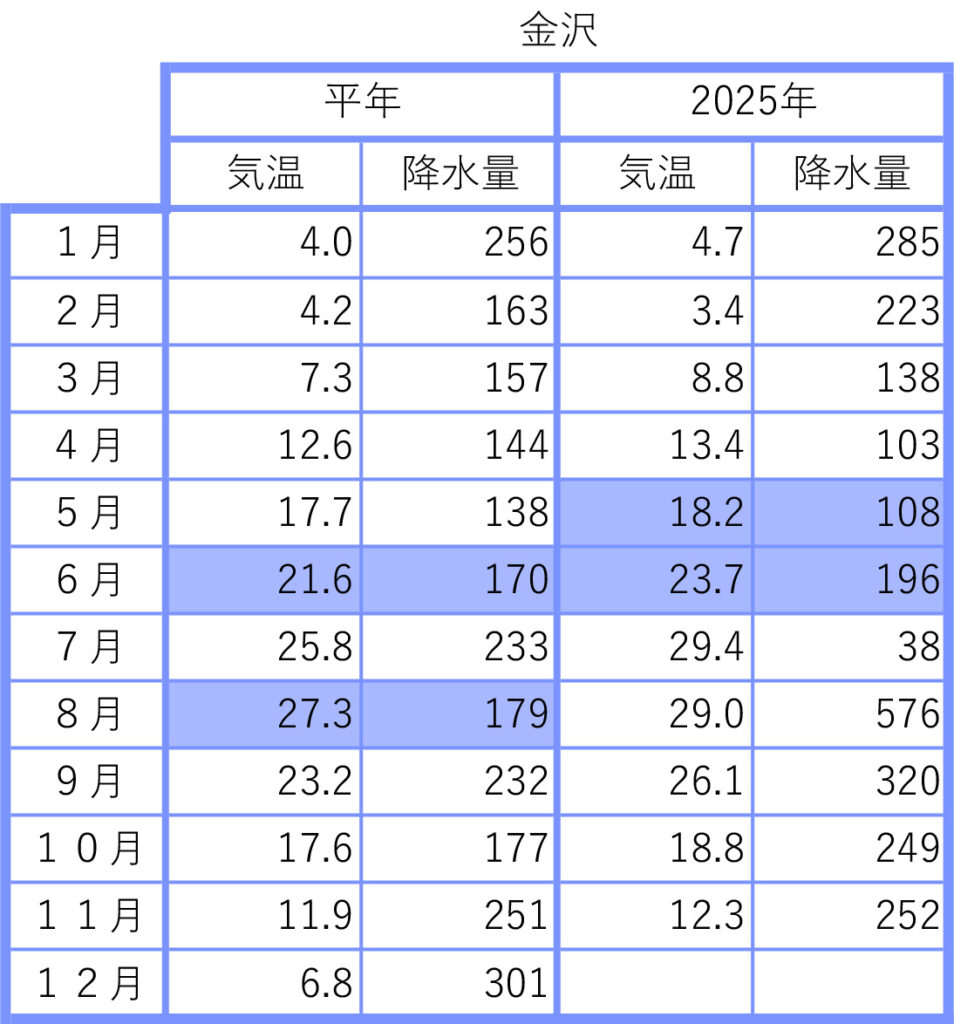 2025年の前月までの月間データを平年値と比較しました。気象庁のウェブサイトから検索し、現地の気象データで補足しました。