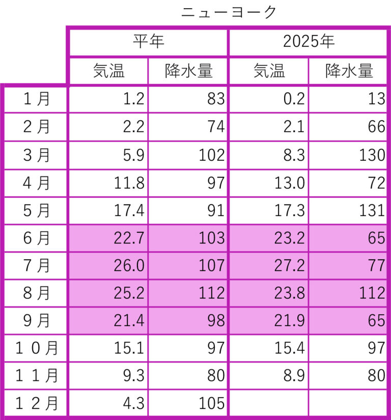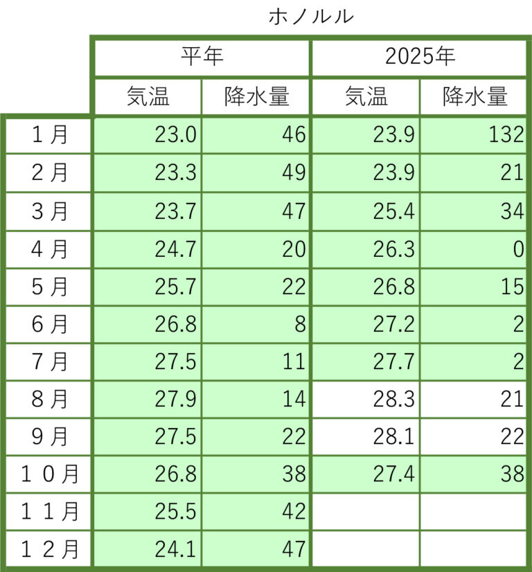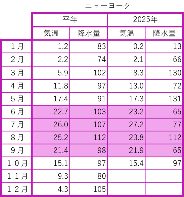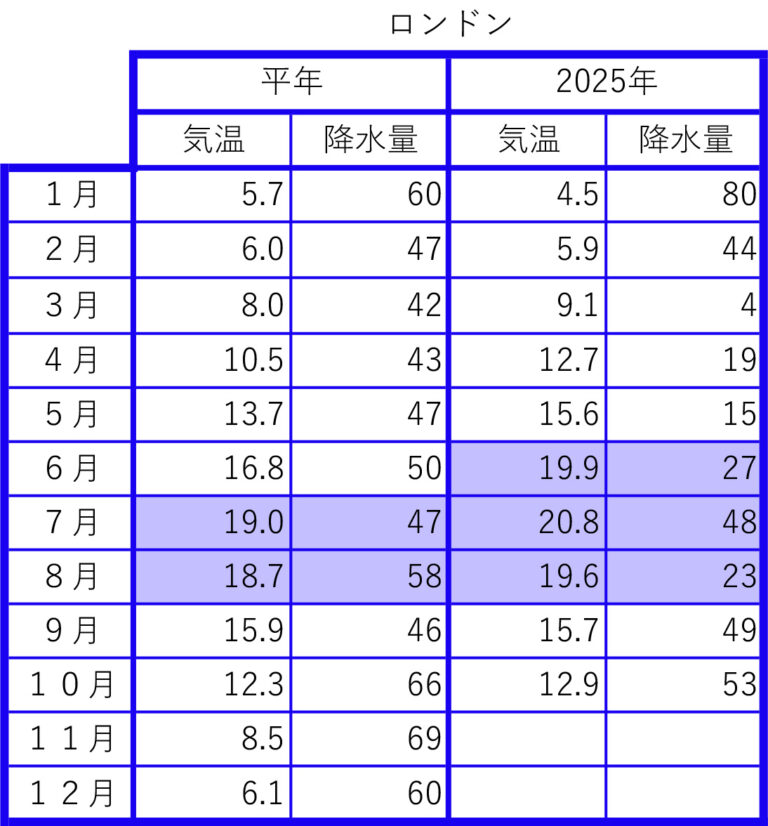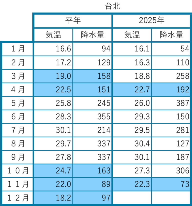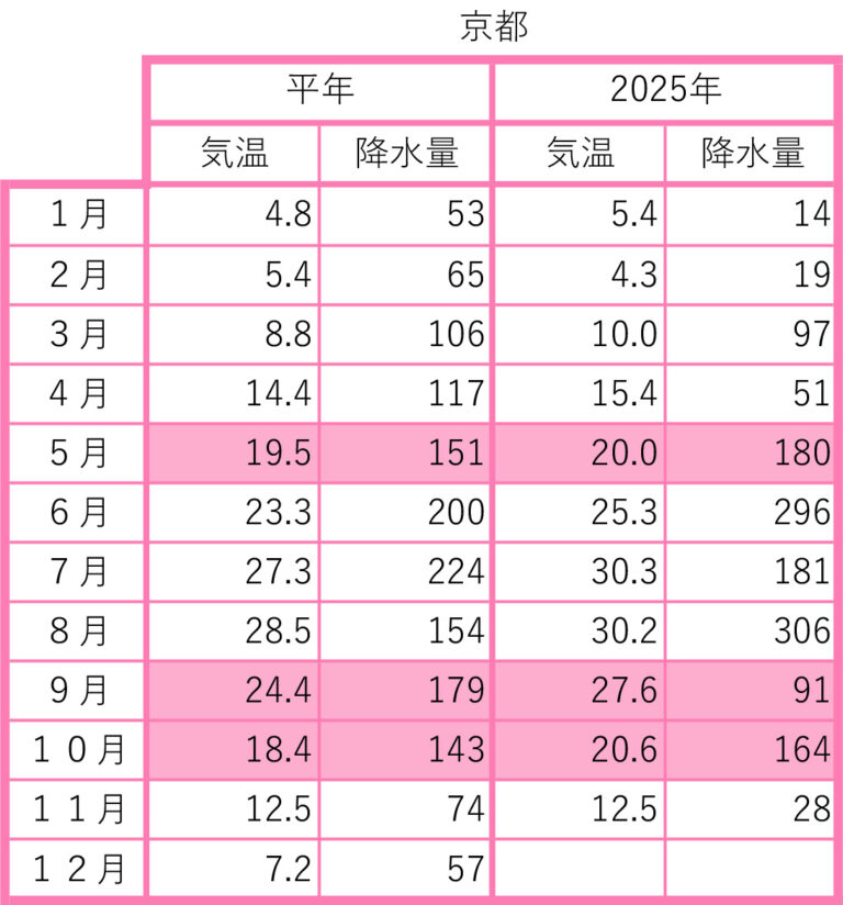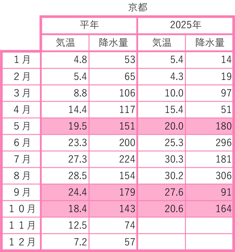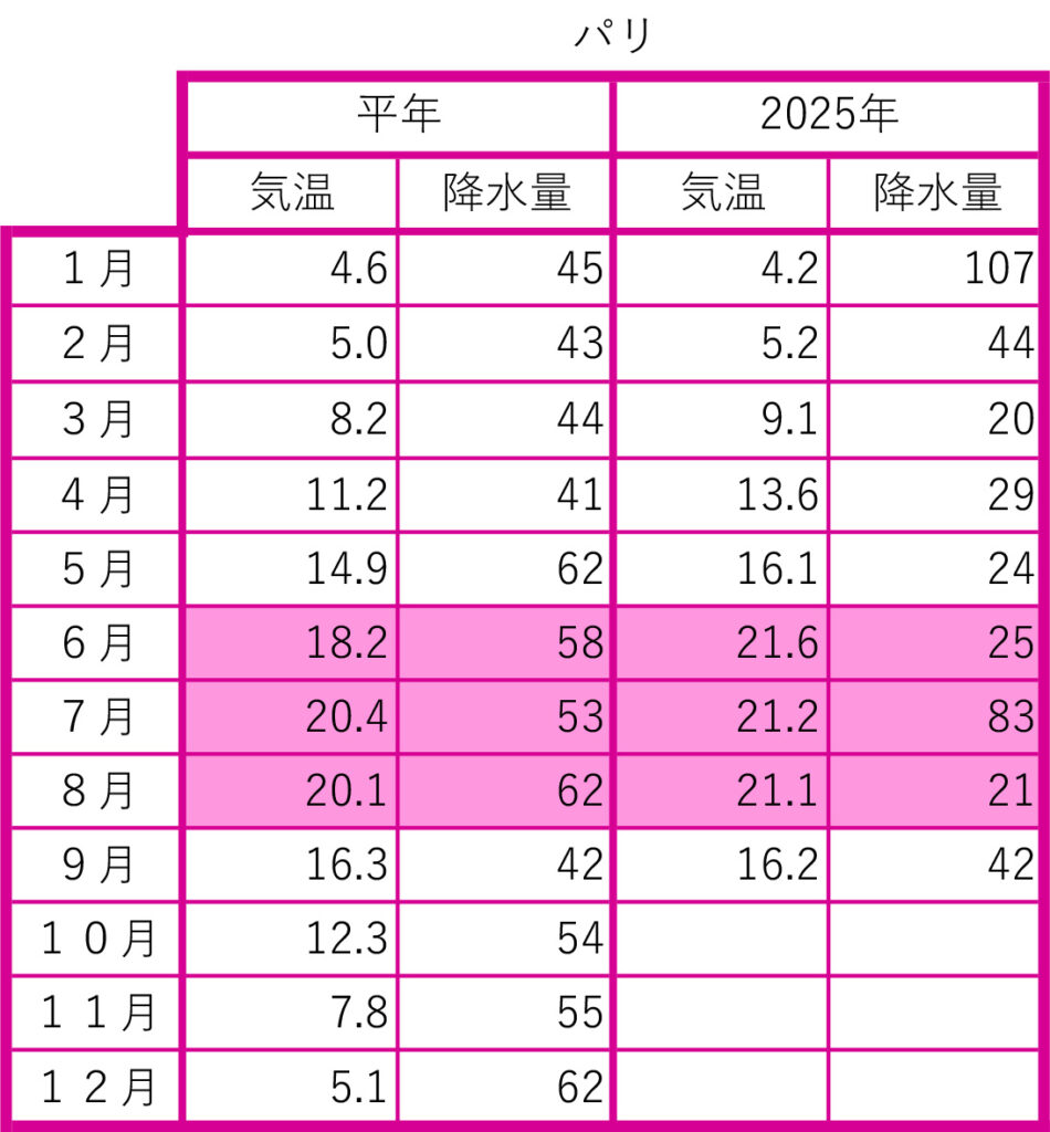 2025年の前月までの月間データを平年値と比較しました。気象庁のウェブサイトから検索し、現地の気象データで補足しました。