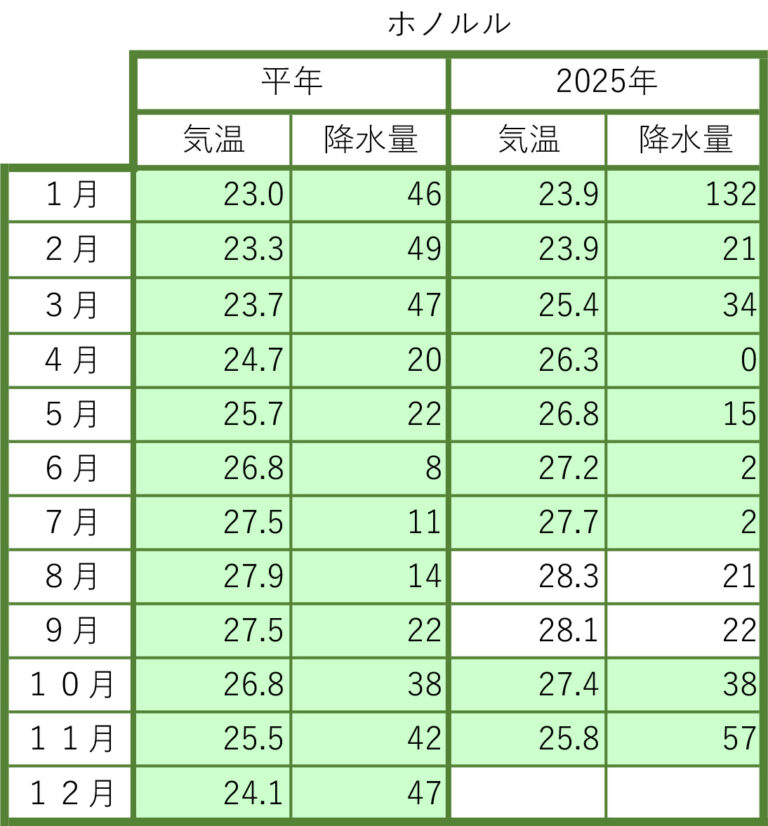 気象庁ウェブサイトで気温、降水量が更新されていない場合は現地気象データで補足することがあります。経験的にアメリカのデータが更新されていないことが多く、その場合、ホノルル、ニューヨークはアメリカ国立気象局が管理するウェブサイト(https://www.weather.gov)から検索し、単位を変換し四捨五入します。ニューヨークはラガーディア空港のデータです。