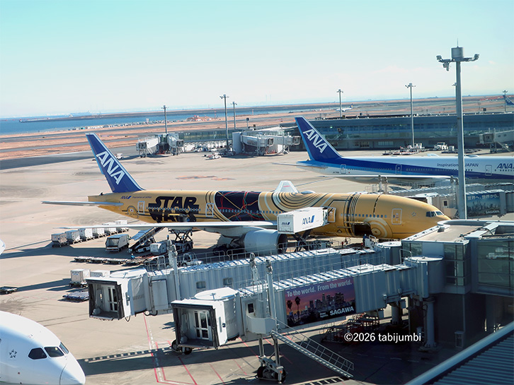 正午すぎに駐機していた C-3PO 特別塗装機は定時であればすでに新千歳空港に向かって飛び立っていたはずの ANA63便でした。