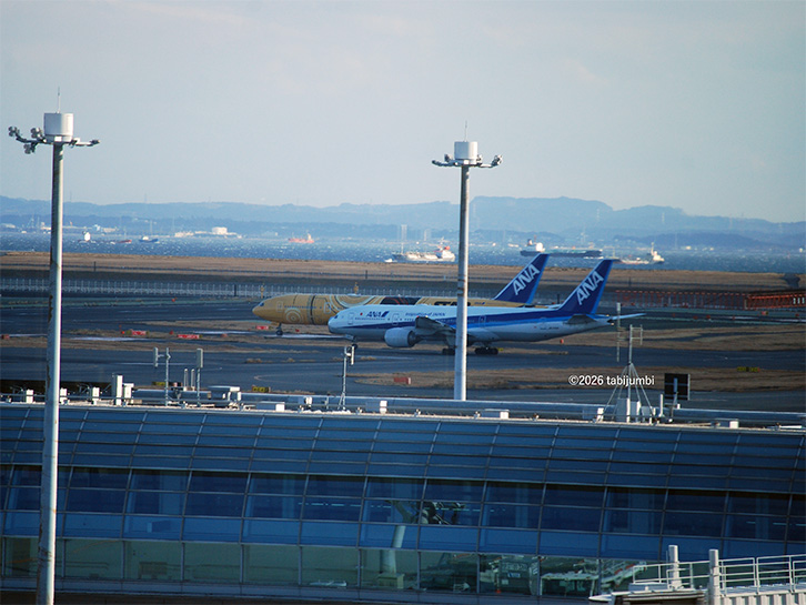 見ていると、後からゲートを離れた福岡空港行きANA255便が追いついてきました、この2機は並行したまましばらく止まっていました。