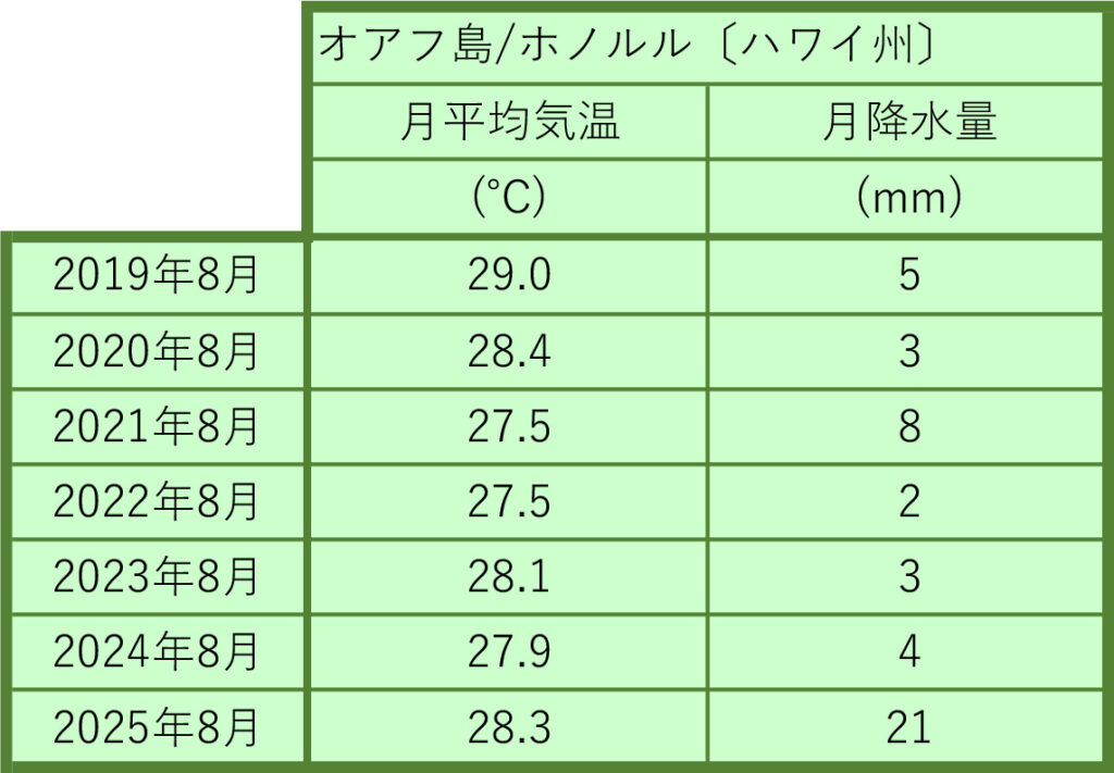 ホノルルでは2025年8月の降水量が21ミリと、過去7年間の8月で最も多かったものの、依然として低水準です。例年よりも雨が少なかった東京でも降水量は69ミリに達しており、それと比べるとホノルルはカラッとした気候だったといえます。気温の変動があっても、現在の東京と比べると、過ごしやすい天候が続いていたようです。