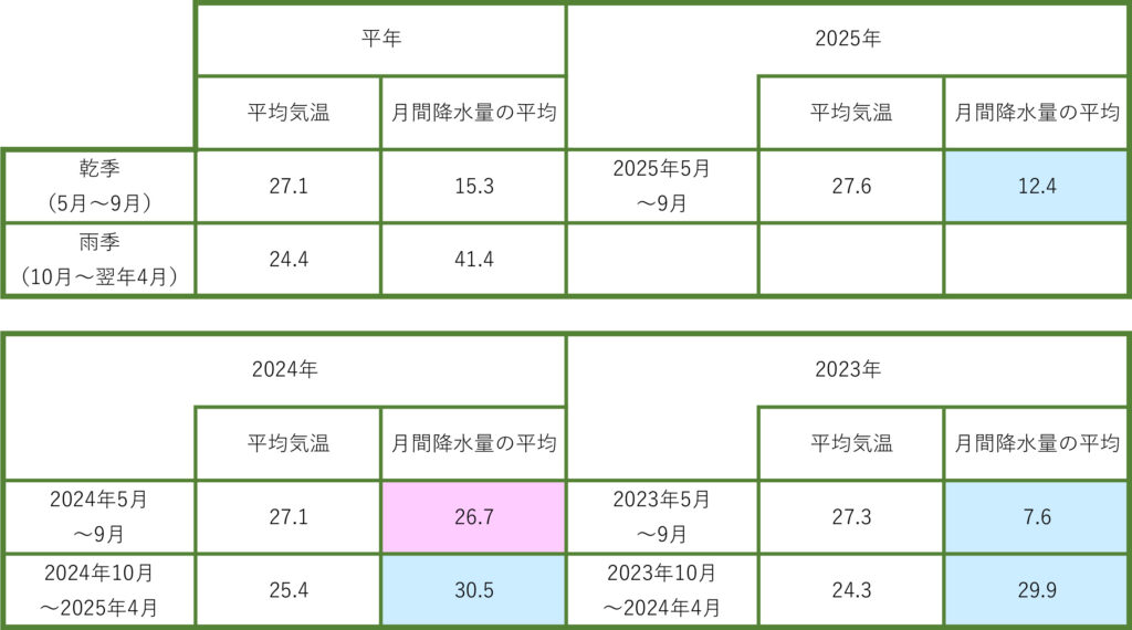 (参考1)TABIJUMBI「主要観光地の気温と降水量」に掲載しているホノルルの2023年~2025年の月間平均気温と月間降水量合計の推移を、乾季(5月~9月)と雨季(10月~翌年4月)で色分けしました。平年は気象庁による1991年~2020年の30年間の平均です。