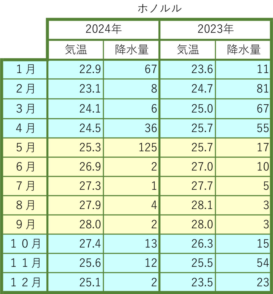 (参考2)TABIJUMBI「主要観光地の気温と降水量」のデータから、ホノルルの乾季と雨季の平均データを算出