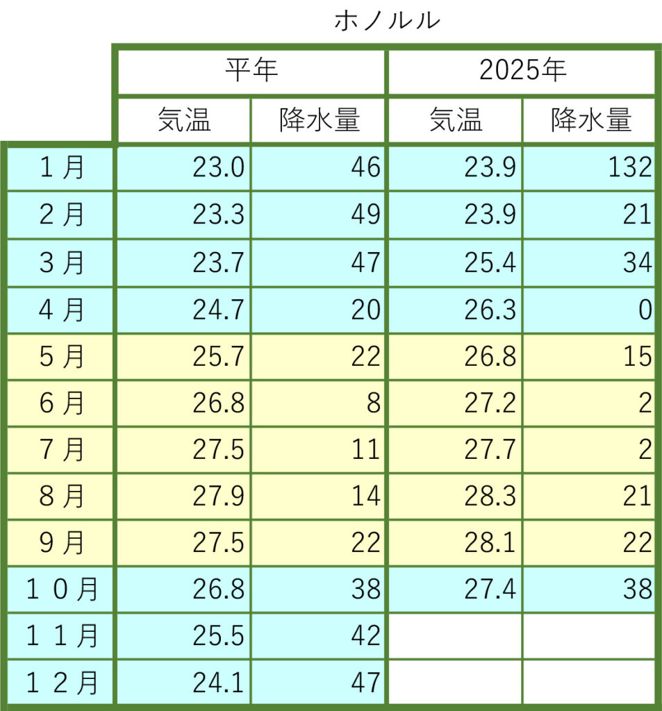 今年の乾季(2025年5月~9月)は降水量が少なく、ハワイ州全体で過去30年で2010年、2007年に次ぐ3番目に乾燥した季節となりました。予想通り雨季シーズンに降水量が増えた場合は、ハワイ州内の乾燥状況が改善される見込みです。