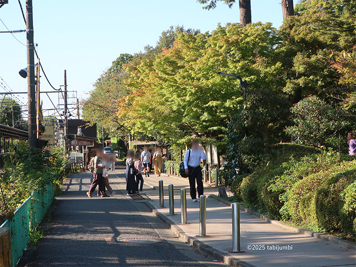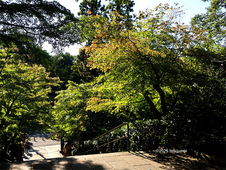 横須賀線の踏切の目の前に階段があり、登ったところが円覚寺の総門です。振り返ると葉が輝いて見えます。色づきが始まったばかりですが、太陽に照らされて緑と黄色のコントラストが鮮やかです。