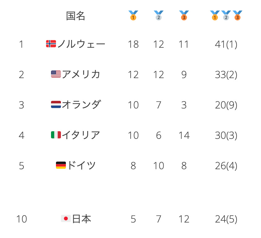 日本🇯🇵は金メダルが5個。ノルウェーには到底およびませんが、スピードスケートで存在感を発揮したオランダや開催国イタリアの10個の半分を取れたのは、結構頑張ったと感じます。