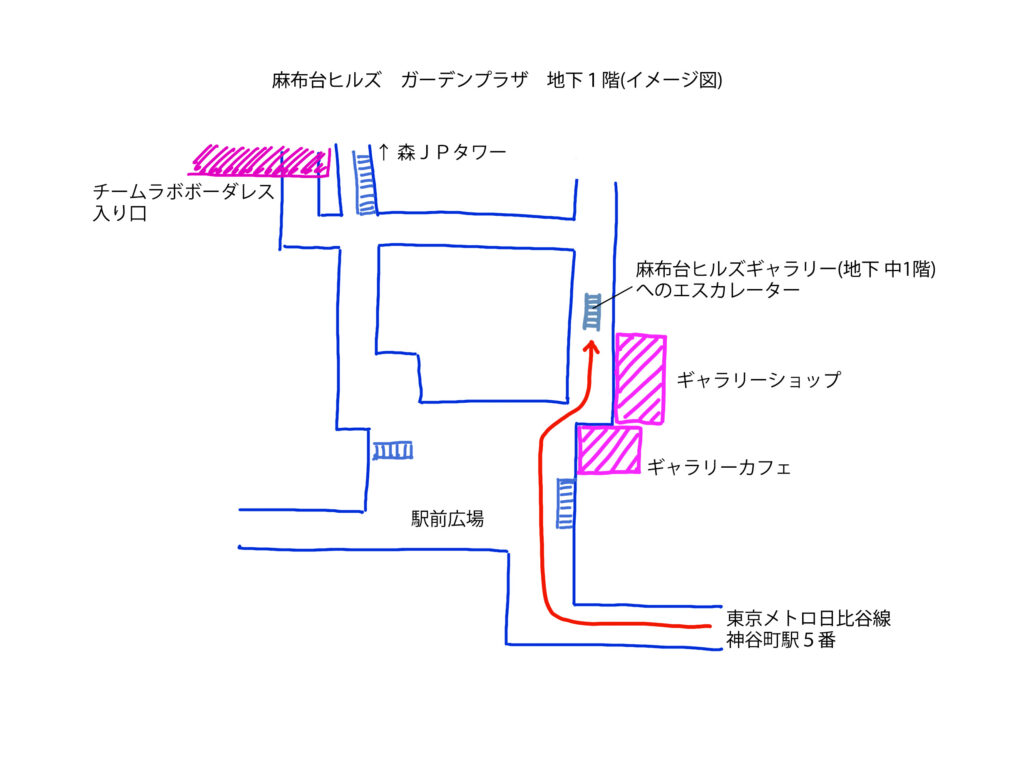 会場の麻布台ヒルズギャラリーは、麻布台ヒルズ ガーデンプラザAのMB階(地下 中1階)にあります。東京メトロ日比谷線・神谷町駅から地下通路でつながるフロアの一つ上の階です。