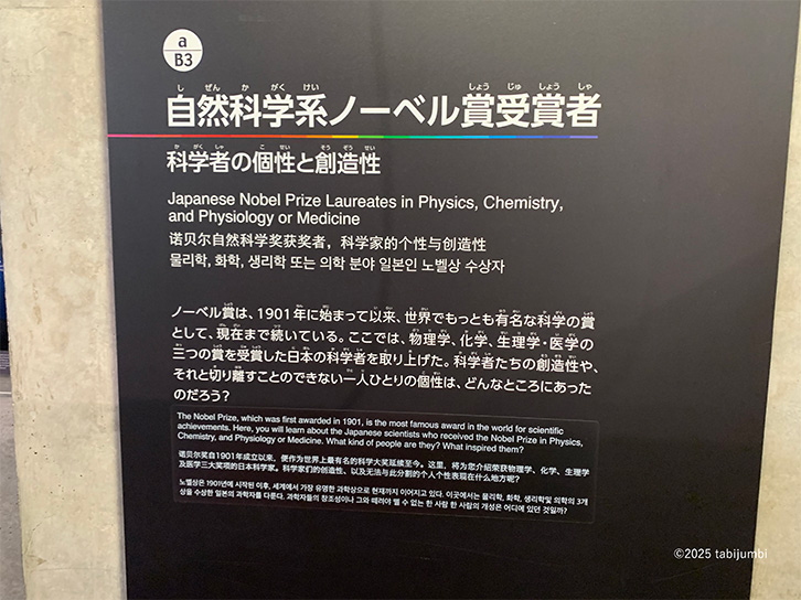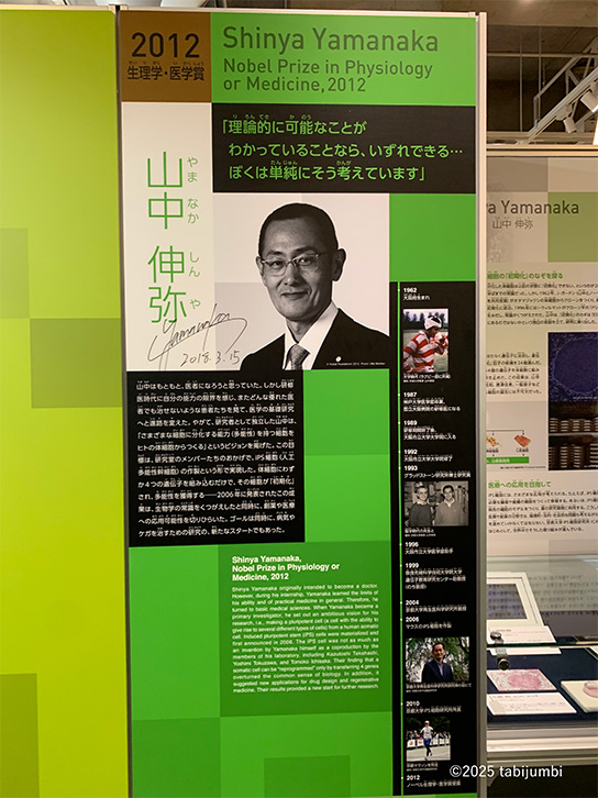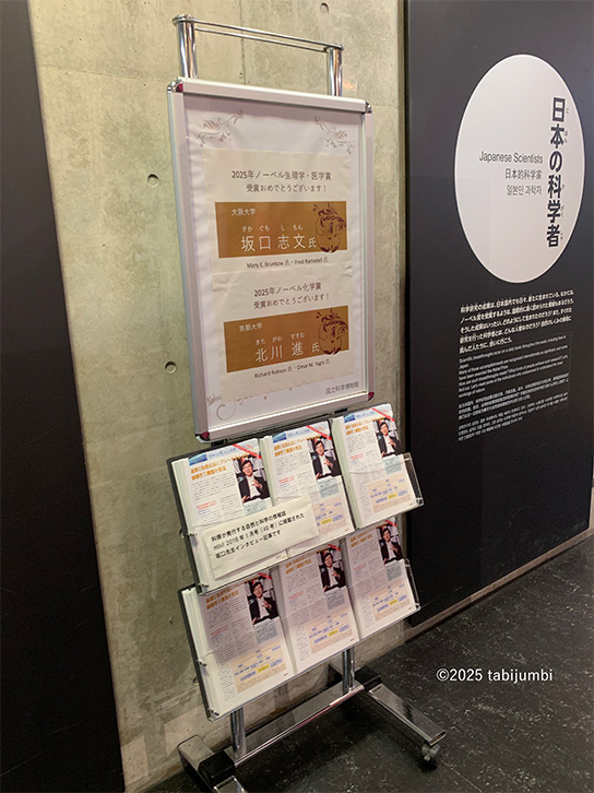 そして、今年(2025年)ノーベル賞を受賞した坂口志文さんと北川進さんは入口近くに案内板が設けられ、来館者に紹介されていました。お二人もいずれこの展示コーナーに加わることになるのだろうと思います。
