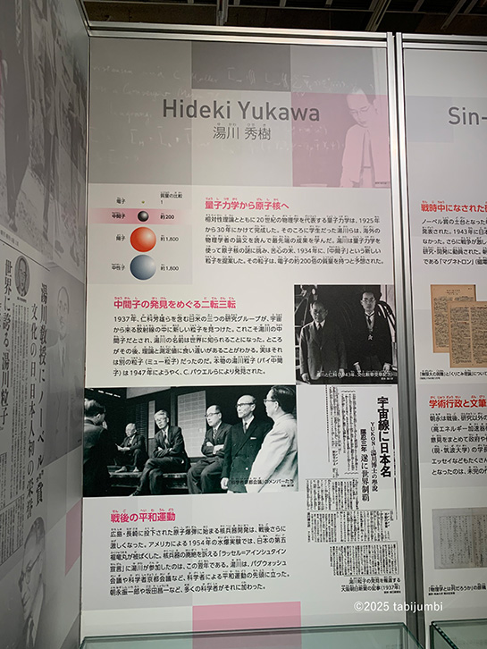 日本人として初めてノーベル賞を受賞した湯川秀樹さんが最初に登場し、スーパーカミオカンデの小柴昌俊さんやトンネルダイオードの江崎玲於奈さん、iPS細胞の山中伸弥さんの業績も説明されています。