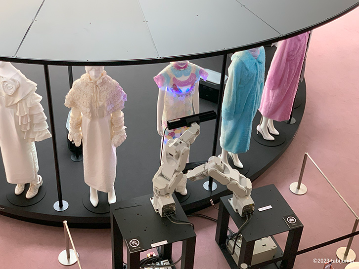 ドレスは1着ずつ動いていきます。半周もしないうちに色は消えていきます。そして、もう半周して再びロボットアームの前に出てくると再び紫外線が投射され、模様が現れます。アンリアレイジのウェブサイトによると「フォトクロミック技術を活用した大胆な色相変化で表層の奥を露わにする”=(イコール)”」というコレクションということでした。