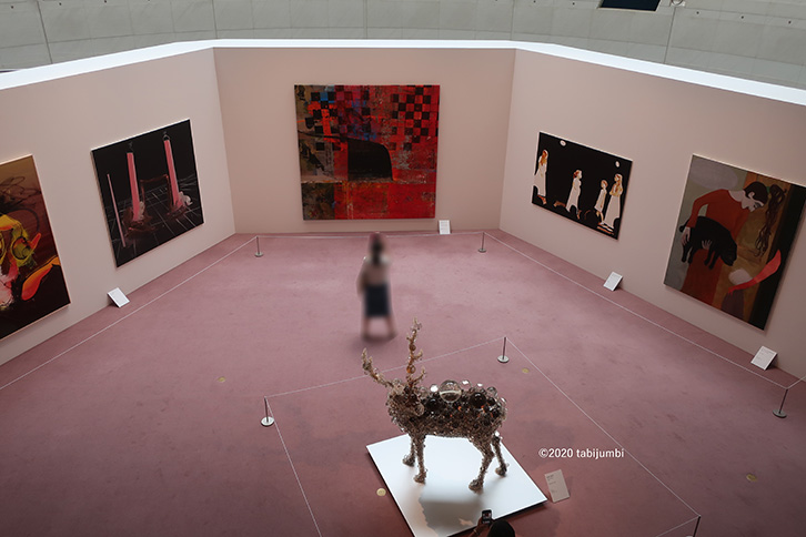 横にあるスロープを登り2階から見ると、鹿と5つの絵画、それを見ている人たちが相互に影響しあってもう一つの作品になっているようにも見えます。