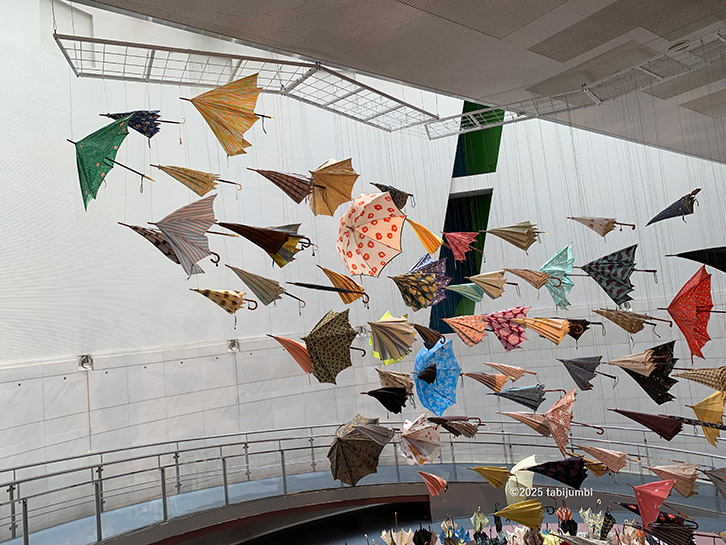 あたかも傘が鳥のように群れをなして飛んでいる姿が表現されていました。物体に心を注入する魔法が、ここにある傘たちにかけられたかのような、おとぎ話、あるいは、アニメのような世界です。