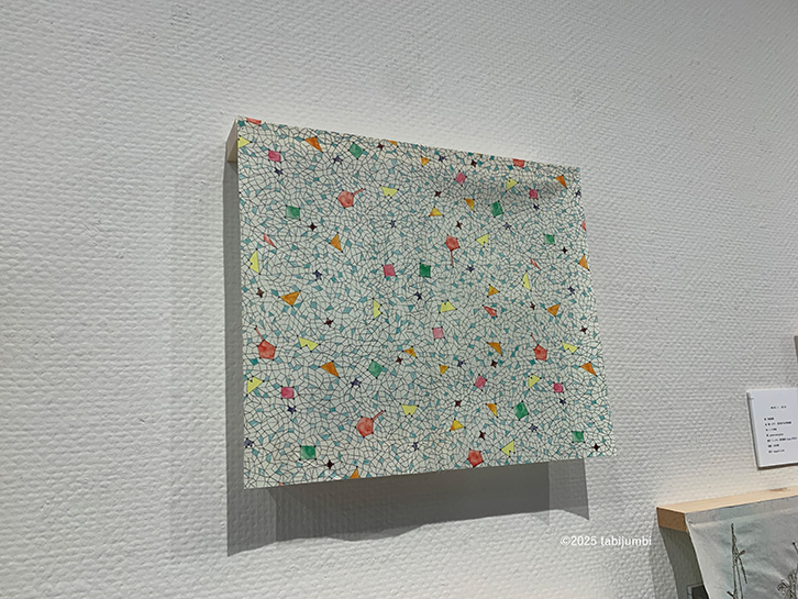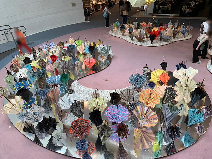 そして、スパイラル1階の一番奥にある吹き抜けのスパイラルガーデンに展開されていた、さきほどの作品が「わたり」でした。たくさんの職人さんたちの手をわたって作られた傘。傘を翳す(かざす)人の手にわたり、直して次の人の手にわたる様子を「旅する鳥のように」表現したということです。