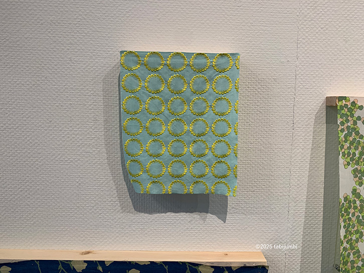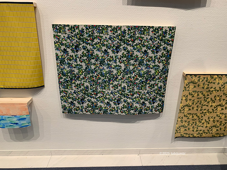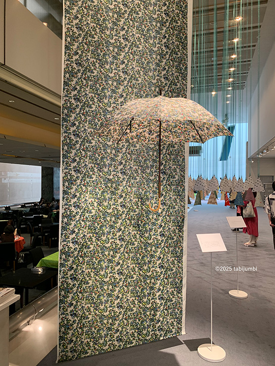 会場入り口近くには縦長の「ブルーベリーの布」が天井からぶら下げられ、その生地を使った傘と並べられていました。