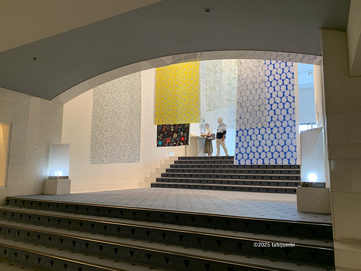スパイラルは2階のショップ、スパイラルマーケットへ階段を上っていきます。そこには複数のテキスタイルが天井から吊るされていました。デザインを重ね合わせ、イメージする空間だということです。