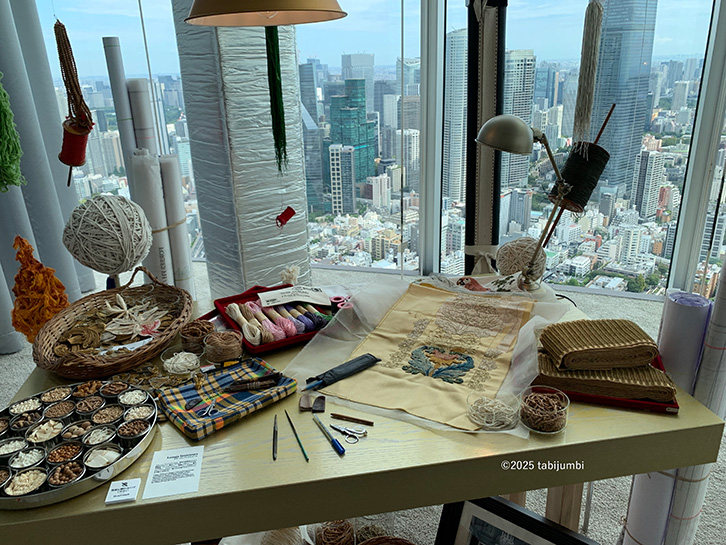 最初の部屋には机が並べられています。一つ一つの机が le 19M に参加しているそれぞれのメゾンダールを示しています。東京の景色を眺められるこの場所に置かれた机は「ルサージュ アンテリユール(Lesage Intérieurs)」。家具や装飾品のための刺繍をデザイン、制作しているメゾンダールの机でした。このほかにも「メゾン ミッシェル(Maison Michel、帽子)」「マサロ(Massaro、靴)」などの机もありました。