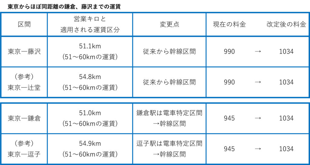 それが、今回の運賃改定で「電車特定区間」が廃止され、鎌倉駅にも幹線区間の運賃が適用されることになります。改定後は東京―鎌倉、東京―藤沢ともに1034円で同じ金額となり運賃格差が解消されます。