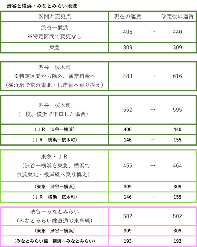 渋谷―横浜を東急線、横浜で一旦降りて、横浜―桜木町をJRに乗った場合、改定後の合計は464円で、東急線・みなとみらい線利用よりもさらに安くなります。