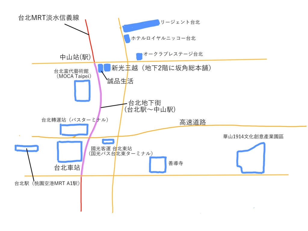 台北駅の一つ隣、中山駅のまわりにはホテルや大型商業施設も集まっています
