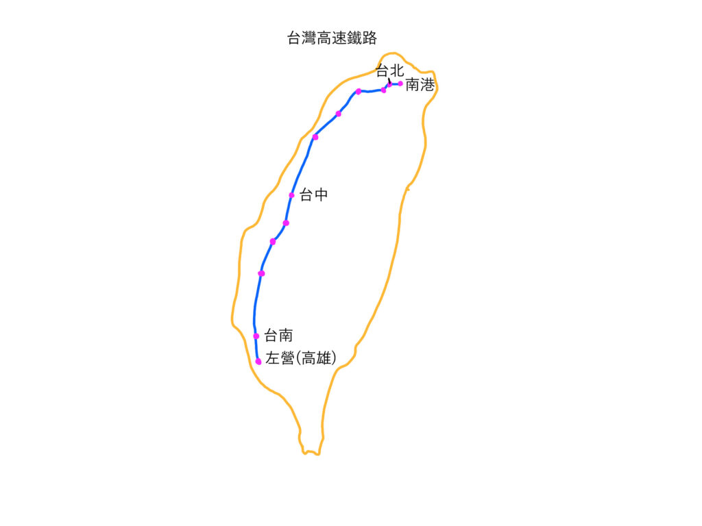 台湾高鉄は、日本の新幹線とほぼ同じ車両が走っており、台北市にある起点の南港(Nangang、ナンガン)駅から高雄(Gaoxiong、ガオション)の左營(Zuoying、ズオイン)駅まで南北約350キロメートルを、台北駅、板橋(Banqiao、バンチャオ)駅、台中駅に停まる特急タイプで約1時間45分、全10駅(南港、左營を含むと12駅)に停まるタイプで約2時間25分で結びます。観光客にとって、台中や台南、高雄といった人気の観光地へ アクセスするのに便利な交通手段です。