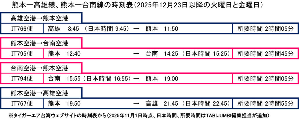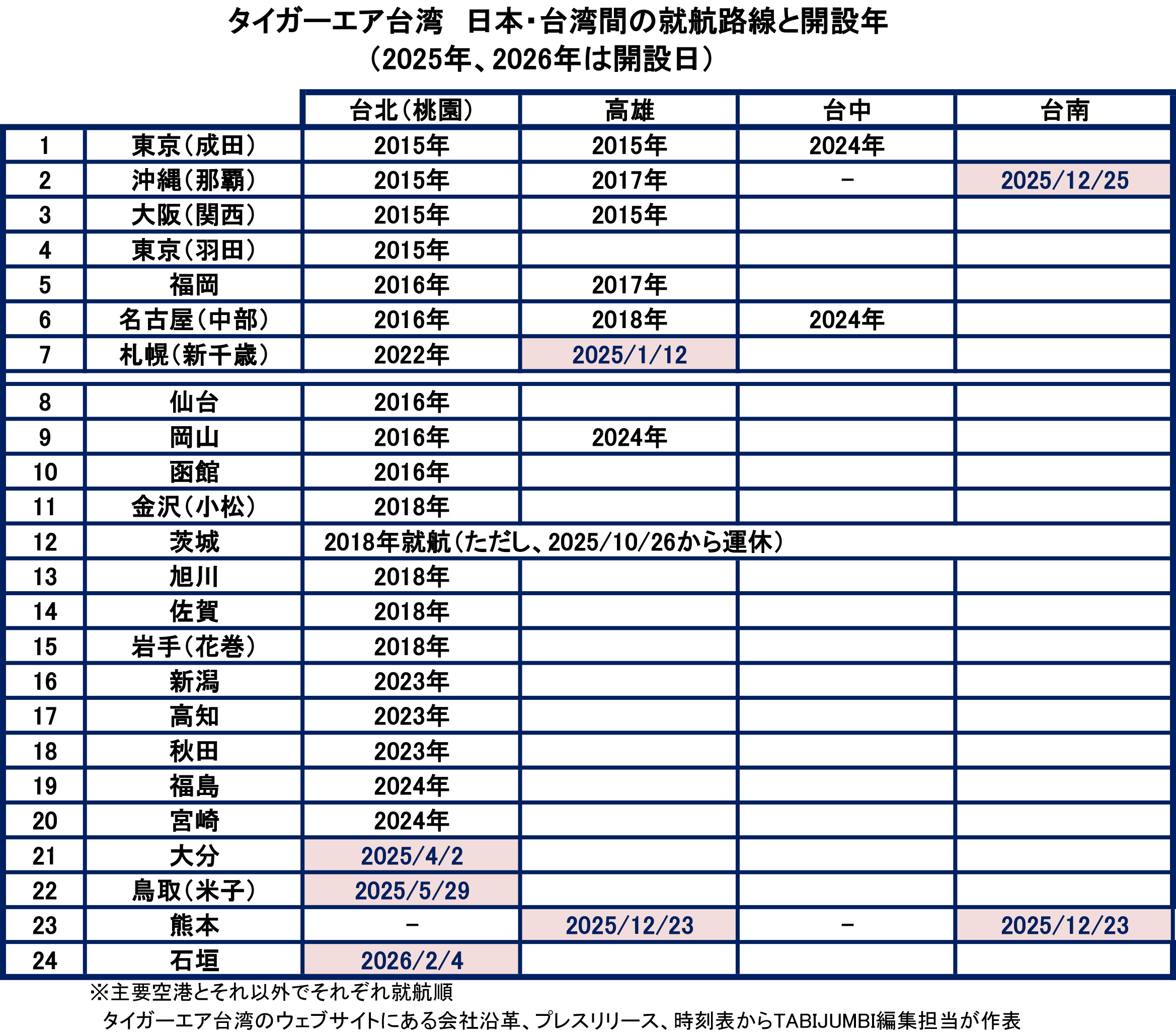 さらに、タイガーエア台湾は12月25日(木)に那覇―台南線も始める予定で、日本と台湾南部を結ぶネットワークが拡大されます。