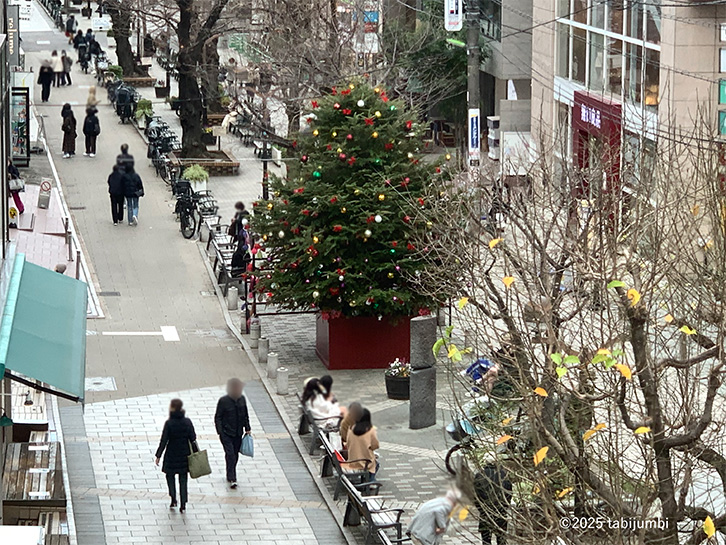 その先頭車両あたりからは自由が丘の特徴的な遊歩道、九品仏川緑道の様子を眺めることができます。この時期は、ベンチの間にクリスマスツリーも飾られていました。