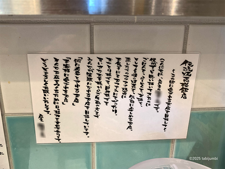 カウンター席の前には店長さんの思いが書かれており、その意気込みが感じられます。