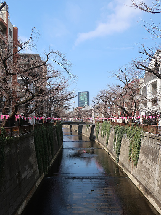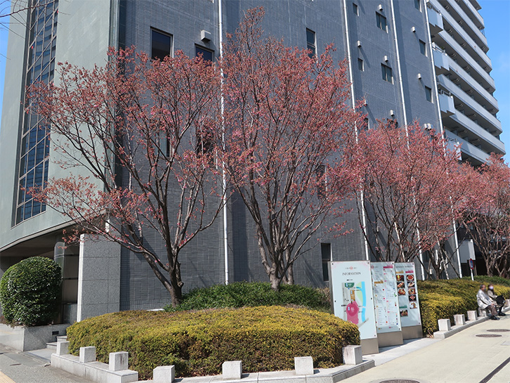 中目黒駅より少し東側。山手通りと駒沢通りが交差するあたりには早咲きのオオカンザクラ(大寒桜)が植えられています。